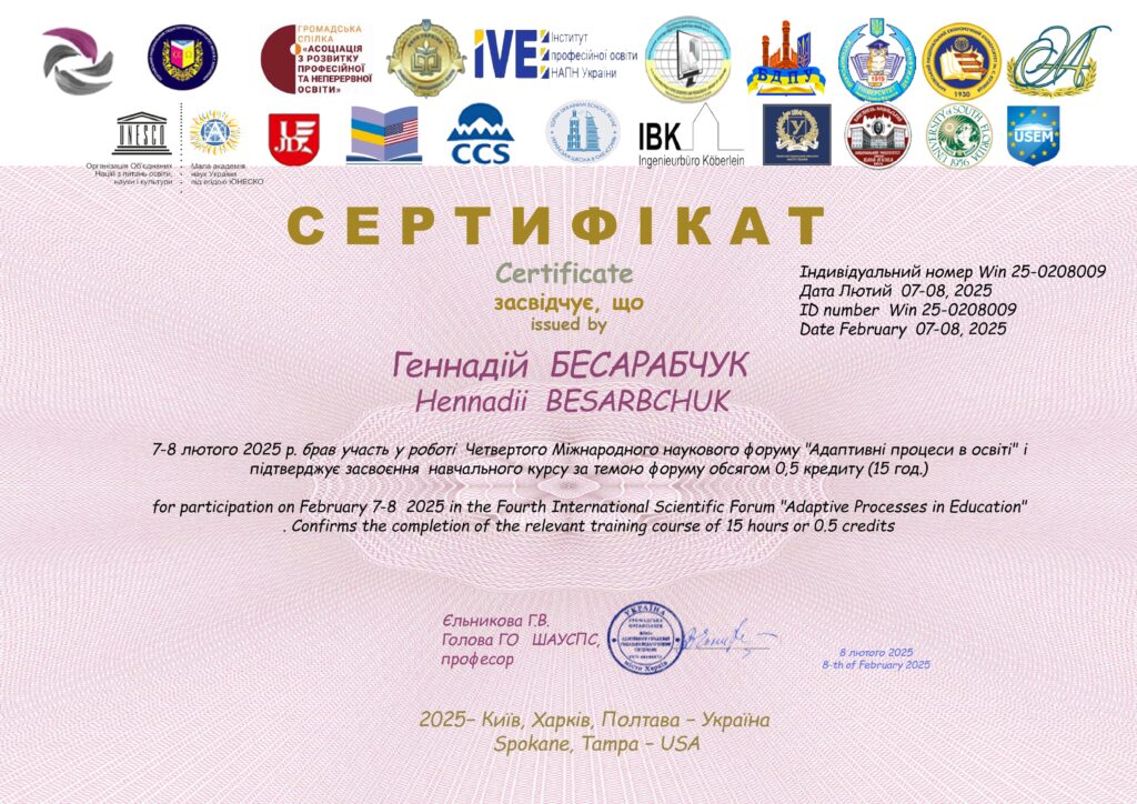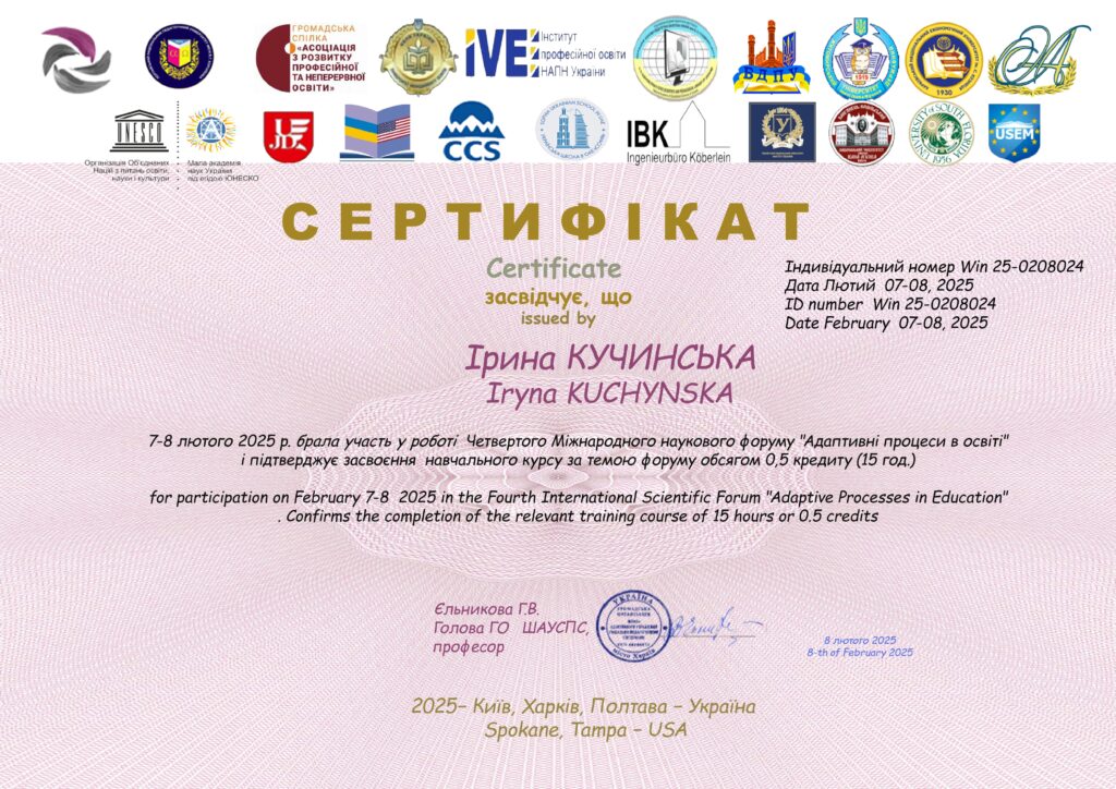 7-8 лютого 2025 року відбувся Четвертий Міжнародний форум «Адаптивні процеси в освіті». Одним із організаторів був Кам’янець-Подільський національний університет імені Івана Огієнка та кафедра педагогіки та менеджменту освіти, яку представляли завідувач, доцент кафедри педагогіки та менеджменту освіти, кандидат педагогічних наук, доцент Світлана ПОЛІЩУК, проректор з науково-педагогічної роботи та міжнародних зв’язків, доцент кафедри педагогіки та менеджменту освіти, кандидат педагогічних наук Геннадій БЕСАРАБЧУК, професор кафедри педагогіки та менеджменту освіти, доктор педагогічних наук, професор Ірина КУЧИНСЬКА. Із програмою заходу можна ознайомитись за покликанням.